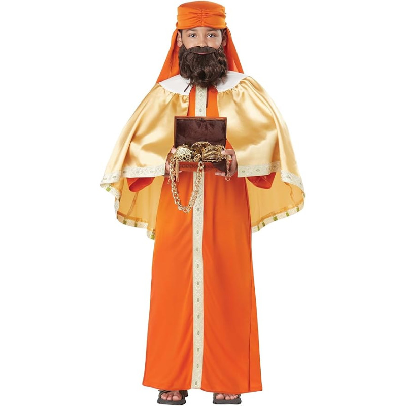 Esta fantasia de luxo do mago Sábio inclui uma roupa em tons laranja e amarelo como uma túnica, inclui uma capa na cor dourada e o turbante com detalhes dourados combinando com o traje.