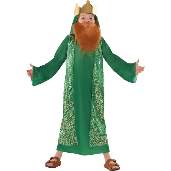 Esta fantasia de luxo do mago Sábio ou pastor, inclui uma roupa em tons verde como uma túnica, inclui uma capa na cor verde e a coroa com detalhes dourados combinando com o traje.