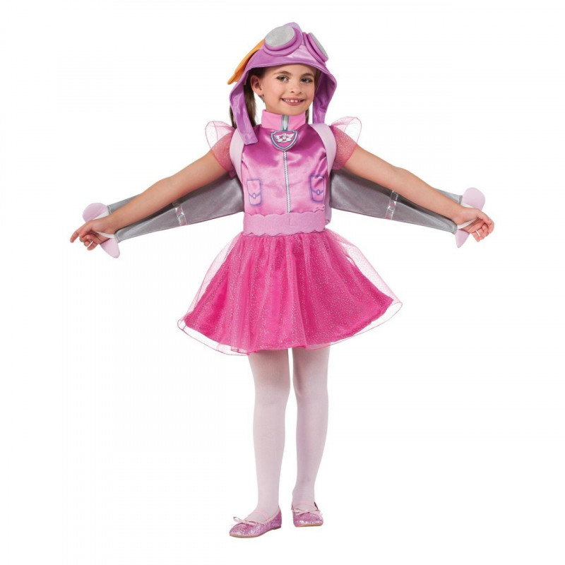 Fantasia da encantadora Skye, que é composto de um vestido cheio de detalhes em pink, chapéu característico e uma linda mochila d personagem.