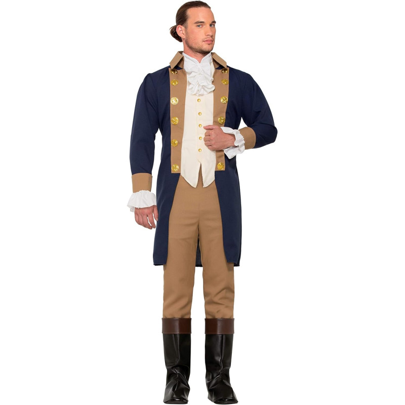 Fantasia Fantasia Soldado Colonial Adulto Luxo. Inclui casaco do uniforme com detalhe em azul e bege e colete bege, calça combinando, gravata branca e imitação de botas completam o traje.