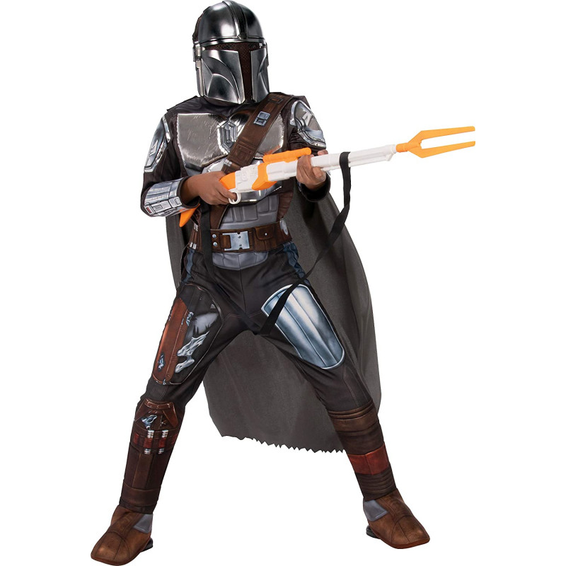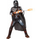 Você vai estar pronto para o duelo com este traje Star Wars Mandalorian luxo que inclui macacão na cor cinza com detalhes imitando armadura em alto relevo em espuma, capa, cinto e uma máscara realística do personagem que cobre o rosto.