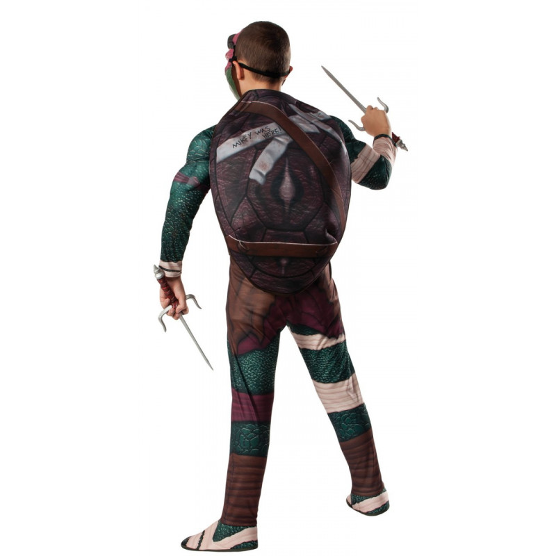 O traje de tartaruga Ninja do personagem Rafael inclui macacão com peito moldado e concha almofadada nas costas, imitação dos pés moldados. Possue cinto de utilidades e máscara do personagem.