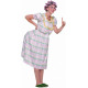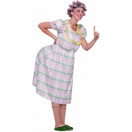 Este traje de tiazinha inclui uma peruca cinza com bobes rosa e um vestido xadrez com busto e nádegas salientes separados.