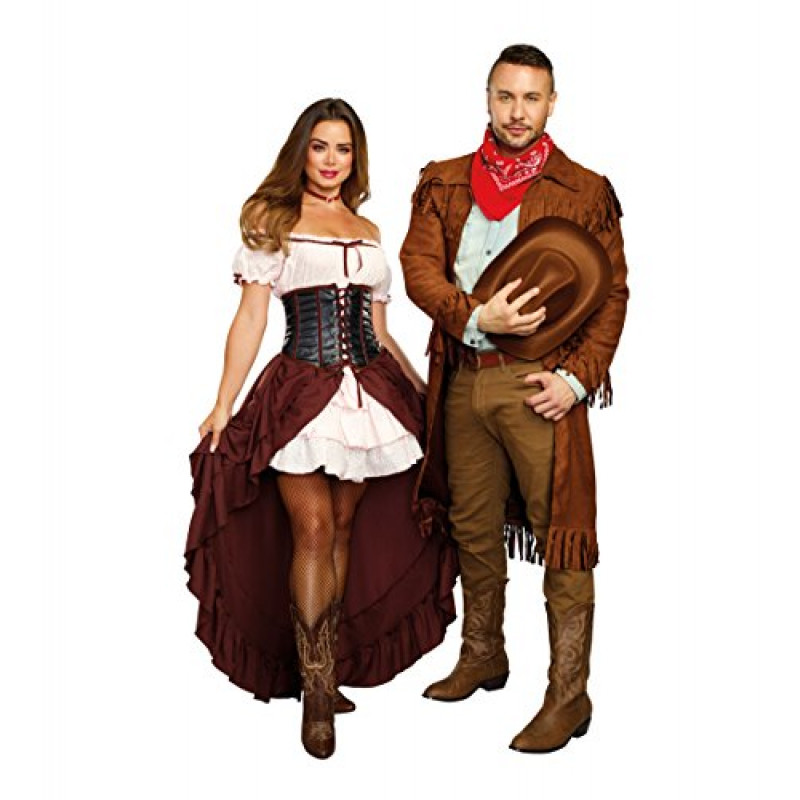 Vestido de ombro de fora em estilo Velho Oeste com saia de babados, possui uma saia anexada e um espartilho de cintura com cordão de amarrar e aparência de couro. (Conjunto de duas peças).