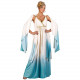 Inclui um vestido longo em tons azul, com mangas longas e detalhes irregulares em todo o vestido. Acabamento em dourado na frente do vestido. Inclui também um enfeite de folhas douradas para a cabeça.