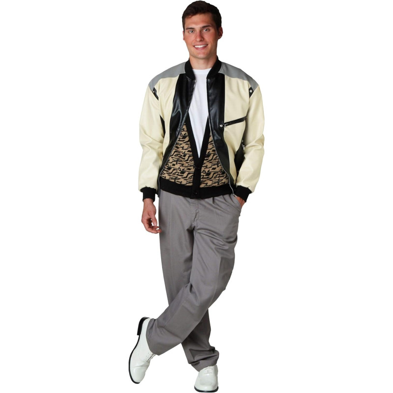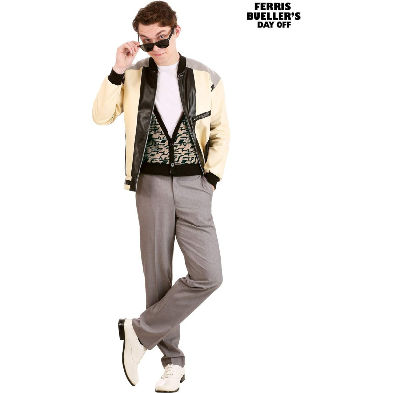 Fantasia do descontraído Ferris, com uma jaqueta imitando couro e um colete com dois botões, como a que o personagem usa no filme.
