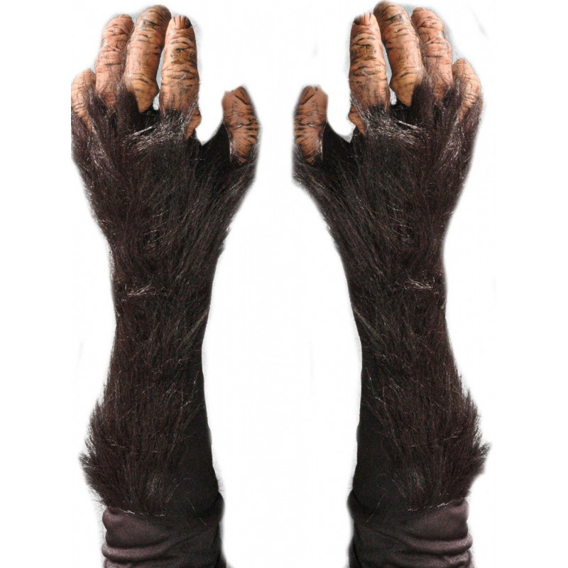 Disfarce composto de luvas de látex para as mãos com detalhes dos dedos, bem realística e com pelo preto em toda a volta.