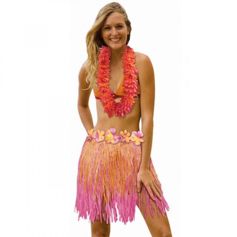 Saia Havaiana, de imitação de Raffia na cor rosada e laranja e detalhe de flores na cintura. Com máximo de 78cm de largura X 45cm de altura.