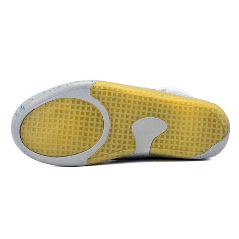 Tênis de Volta para o Futuro Marty Mcfly com Luz, com material de tecido de malha, sola de borracha texturizada para tração. Alça de velcro ajustável ao tornozelo e elástica em cima dos sapatos.