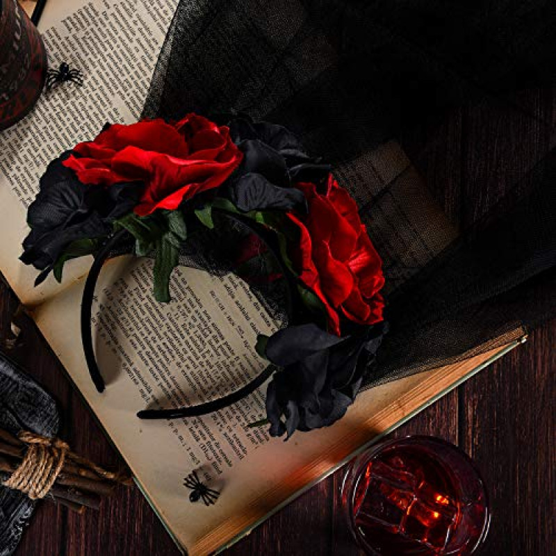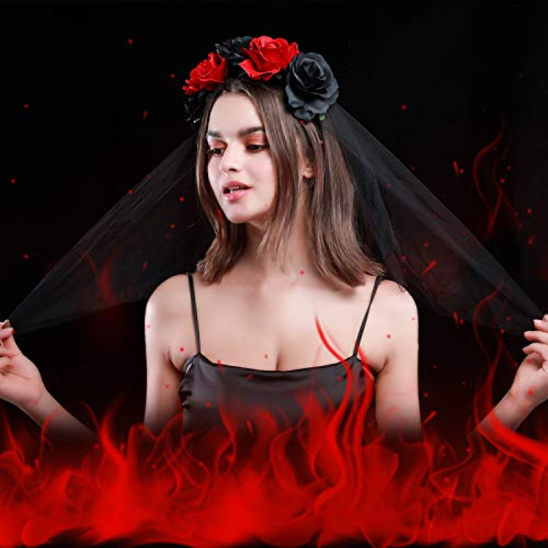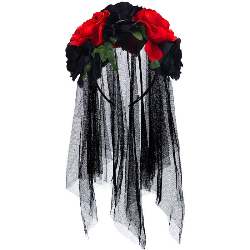 Inclui tiara com flores nas cores vermelho e preto, intercaladas. Com um adorável véu preto, perfeito para completar seu traje.Inclui: